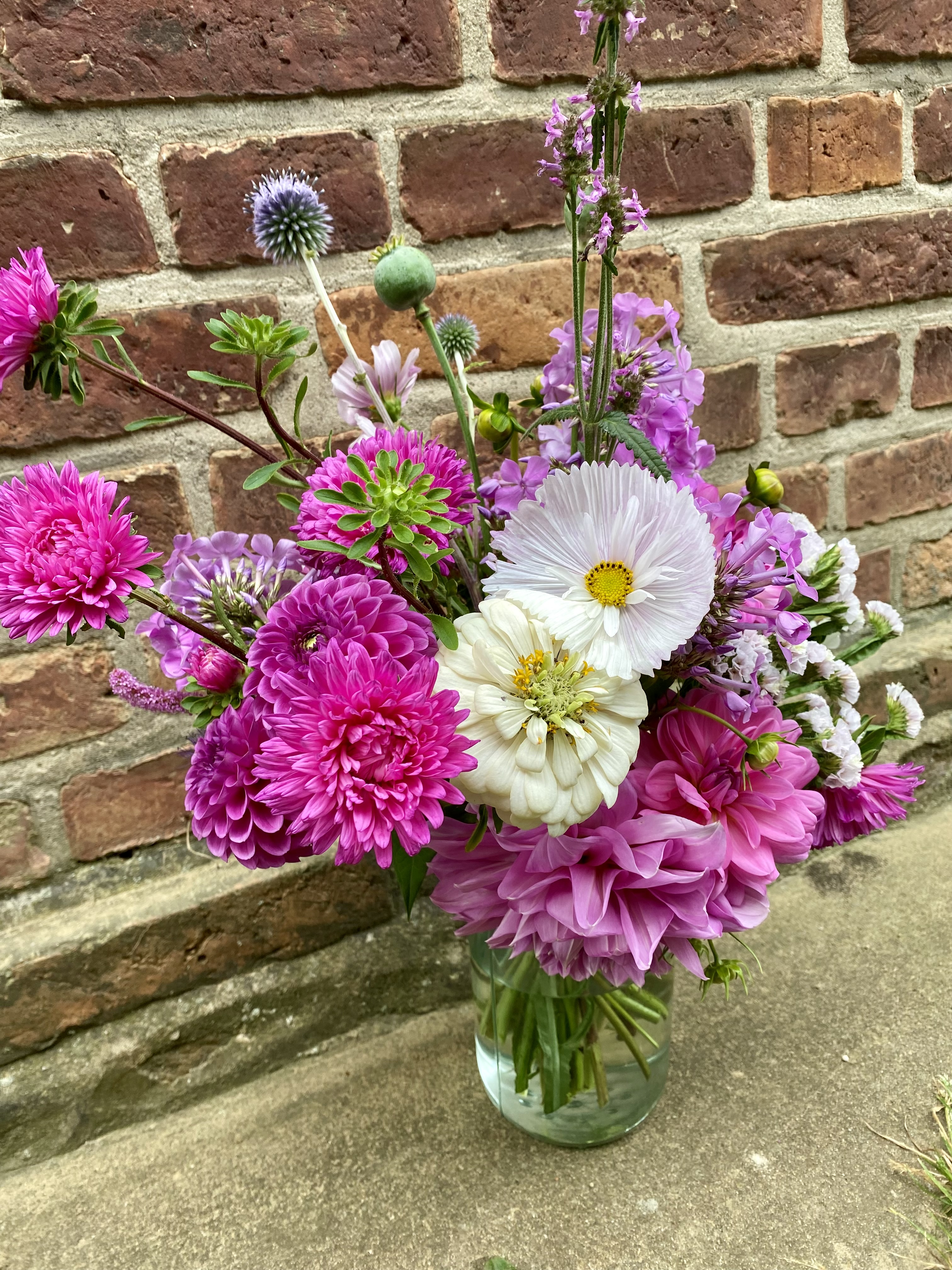 Strauß mit Kugeldistel, Mohn, Strandflieder, Dahlien und Cosmeen