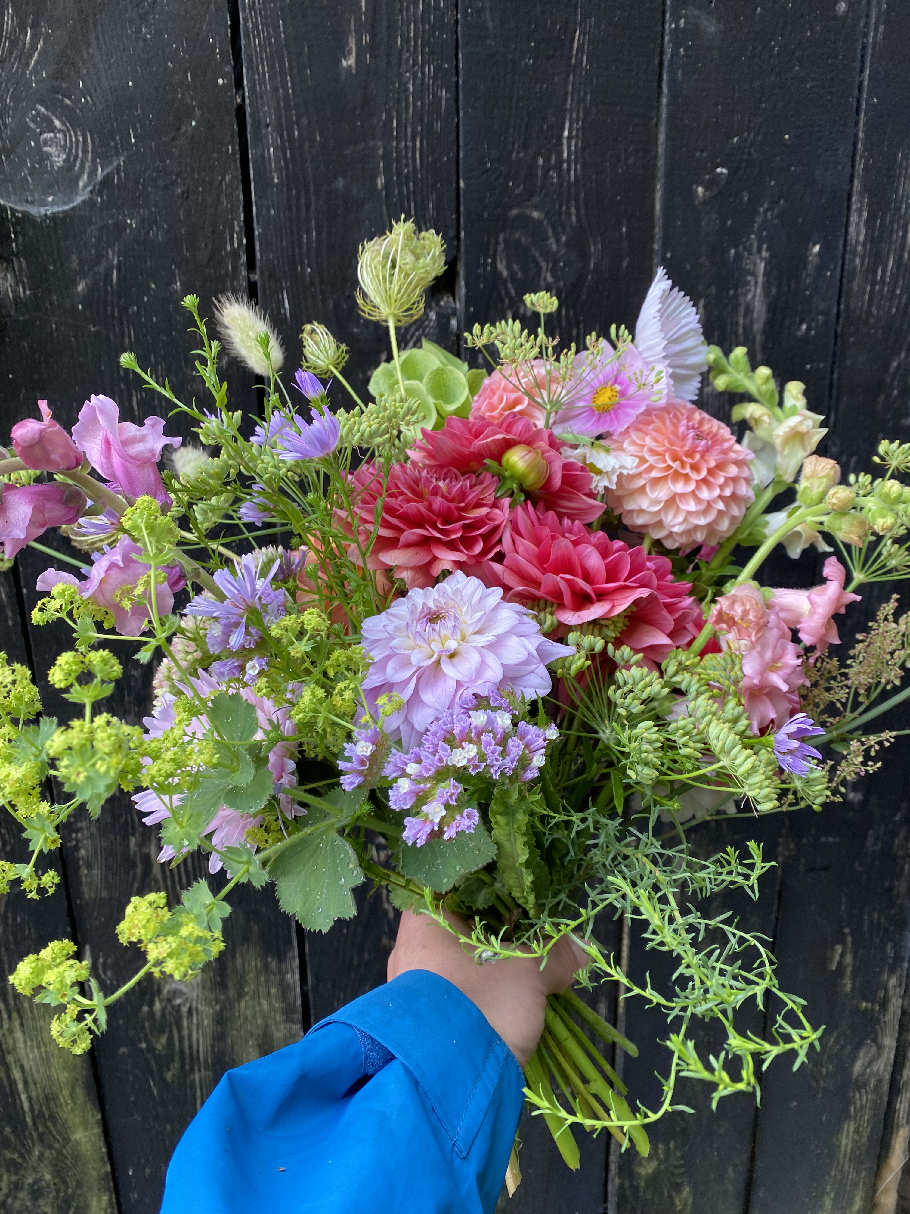 Strauß mit Wilder Möhre, Frauenmantel, Löwenmäulchen und Dahlien